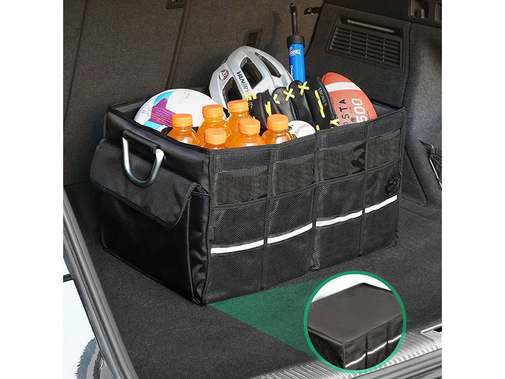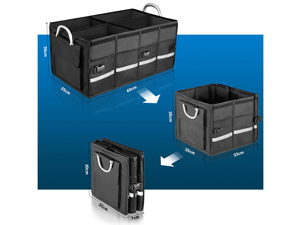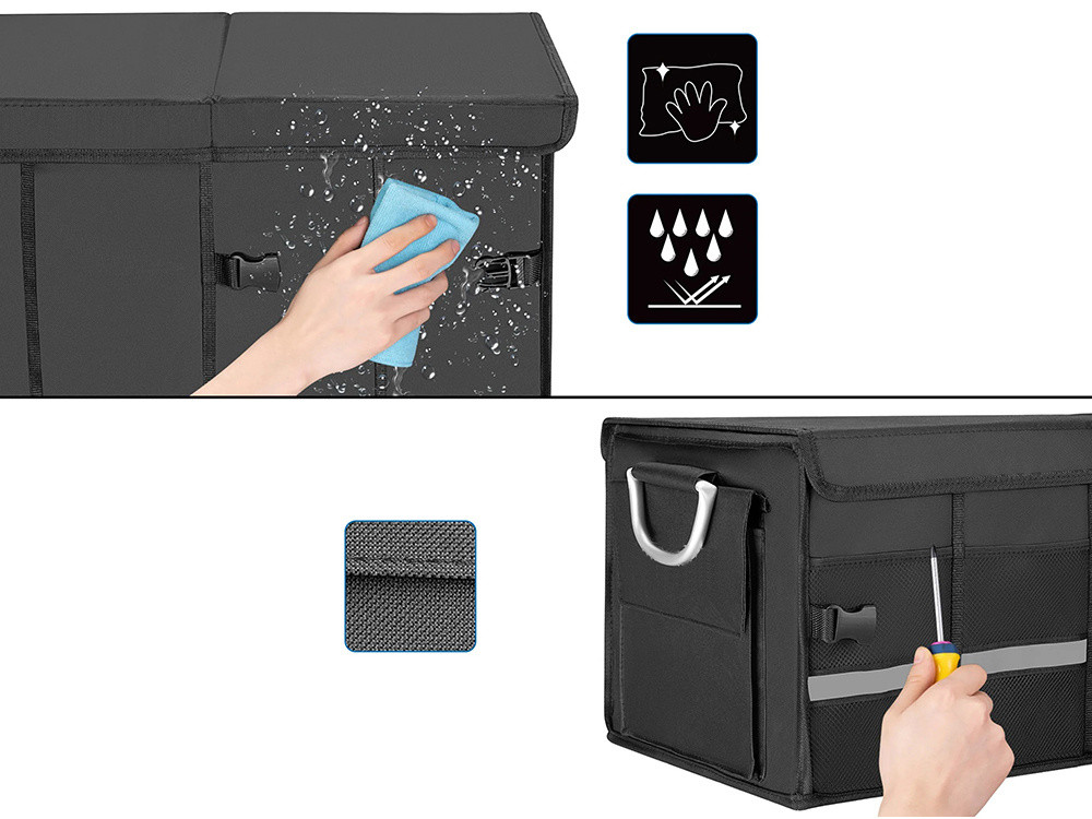 Taška s veľkým objemom 60 litrov pojme všetko príslušenstvo do auta, náradie alebo praktické veci. Organizér je vyrobený z nepremokavého materiálu, ktorý chráni obsah pred dažďom alebo blatom. Bez ohľadu na počasie bude váš kufor vždy suchý a uprataný.
