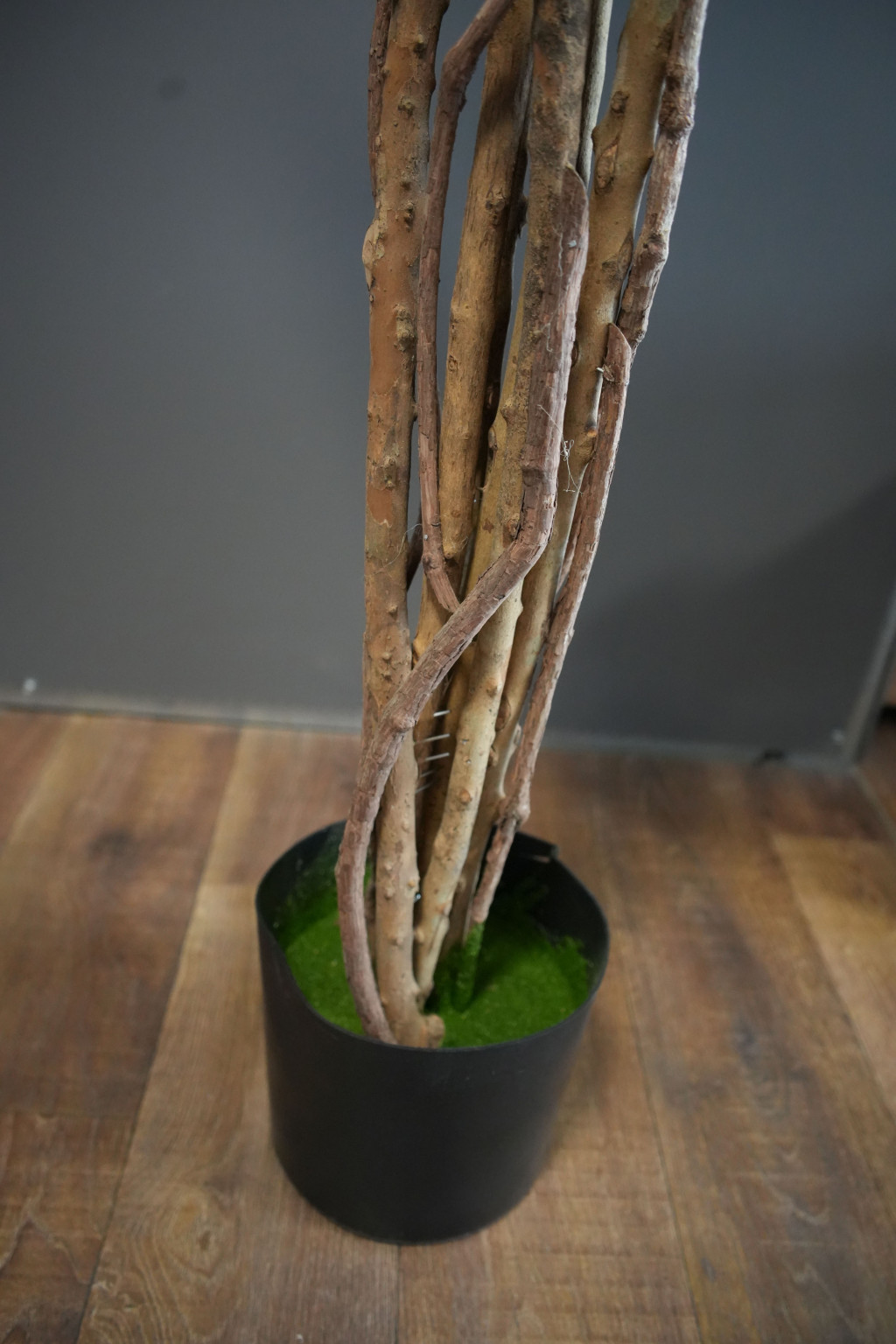 Realistický umelý strom je pevne upevnený v plastovom kvetináči.